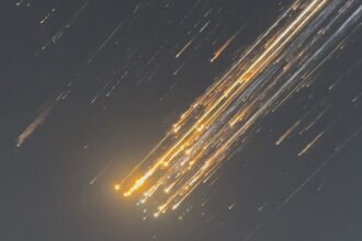 Oranžiniai šviesos rutuliai skraido dangumi, kai 2025 m. sausio 16 d. virš…