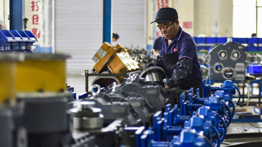 Darbuotojas, montuojantis krautuvo transmisijos mechanizmą gamintojo Čingdžou mieste, Kinijoje.