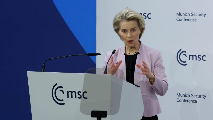 Europos Komisijos prezidentas Ursula von der Leyen kalba per 61 -ąją Miuncheno saugumo konferenciją 2025 m. Vasario 14 d. Miunchene, Vokietijoje. Tarptautinės gynybos ir saugumo lyderiai iš viso pasaulio susirenka į vasario 14-16 dienomis.