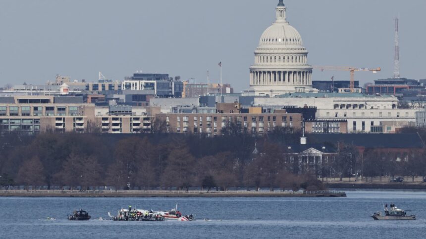 Avarinės pagalbos personalas dirba netoli katastrofos vietos, kai JAV kapitulas yra fone, po to, kai „American Eagle Flight 5342“ susidūrė su „Black Hawk“ sraigtasparniu, artėjant prie Ronaldo Reagano Vašingtono nacionalinio oro uosto ir sudužęs Potomac upėje, JAV, JAV, 2025 m. Sausio 30 d.