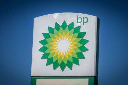 BP logotipas eksponuojamas už degalinės stoties netoli Warminster, Viltšyre, Anglijoje, 2022 m.…
